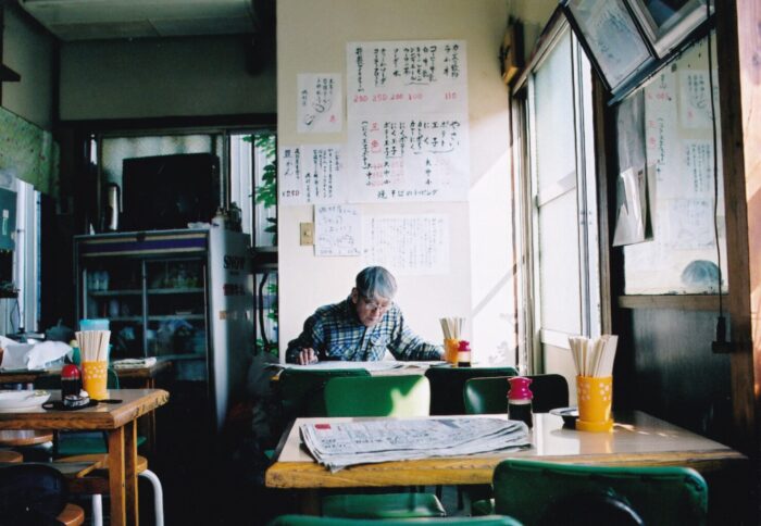 A camera observes a small restaurant run by an elderly couple.